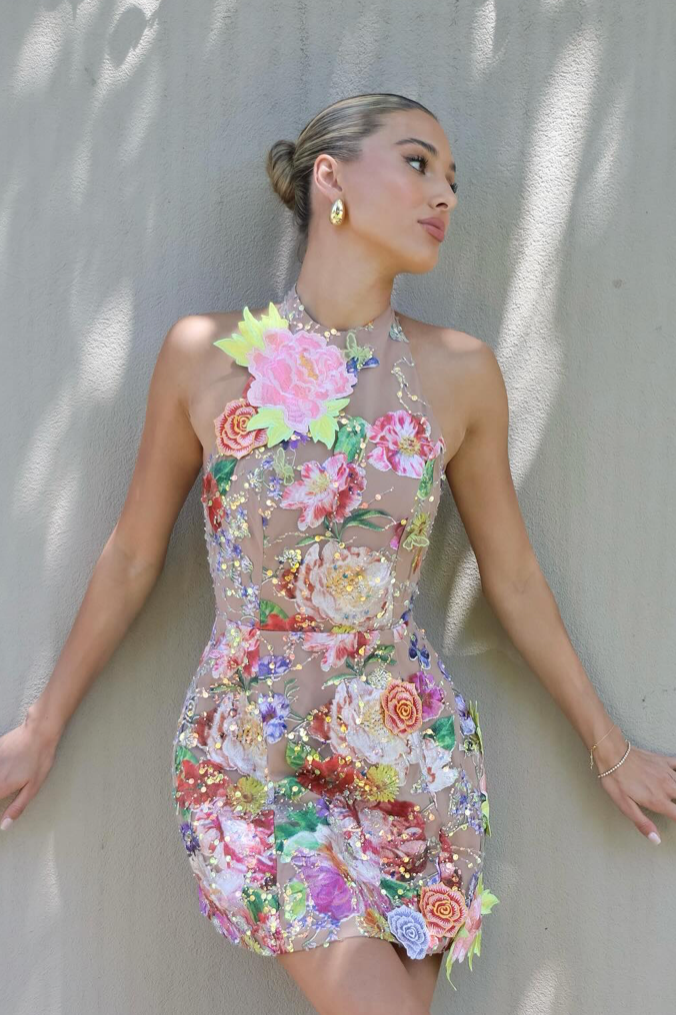 Crafted with meticulous attention to detail, the dress features 3D floral embroidered mesh and sequins in soft pink, radiating luxury and femininity. The intricate floral pattern adds depth and texture, catching the light with every movement. An exposed metal centre-back zipper provides a modern edge and ensures a perfect fit.