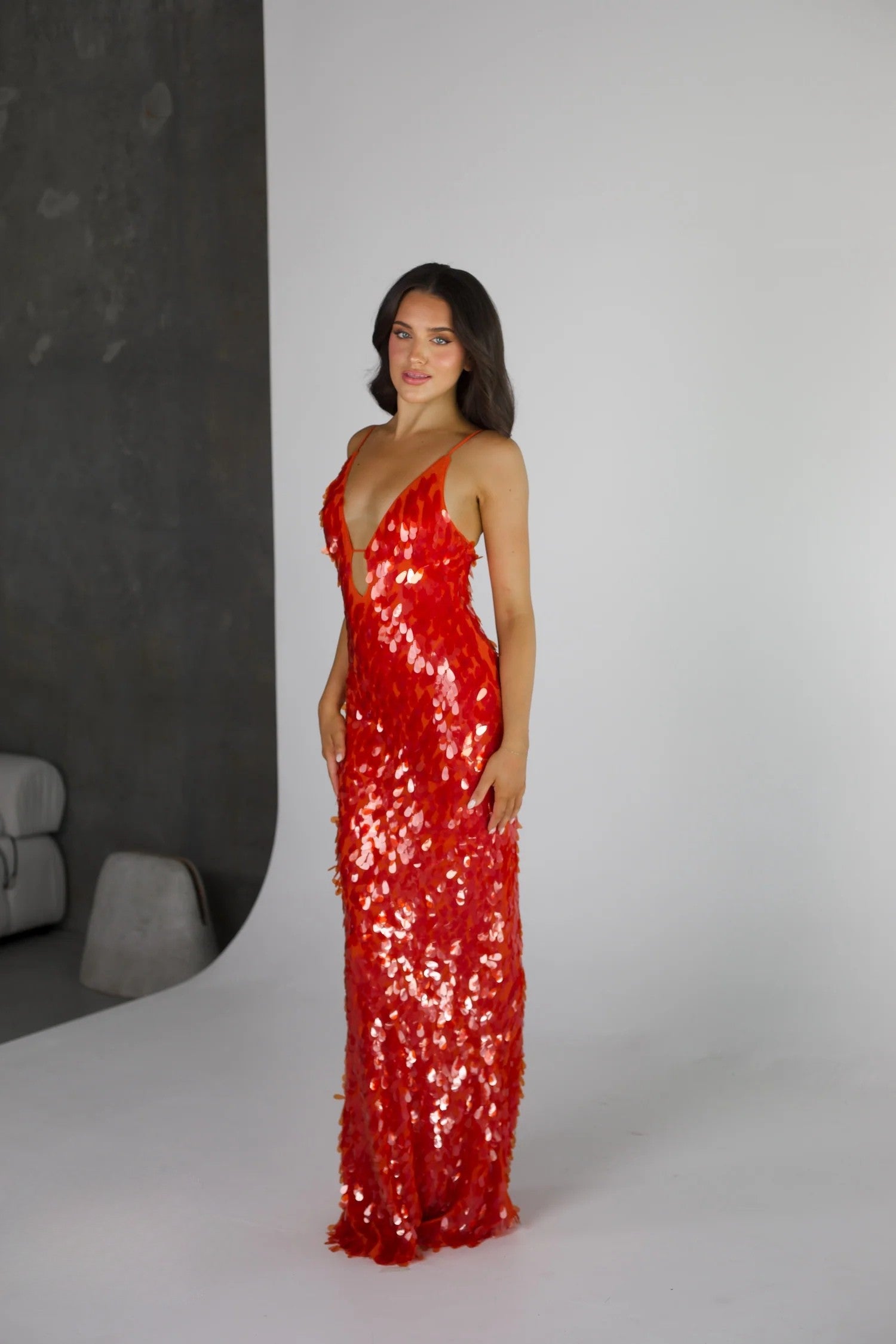 Each sequin shimmers with fluid movement, reflecting light like the ripples of water, for a truly mesmerizing effect. A plunging neckline and low back bring a daring edge, ensuring all eyes are on you.